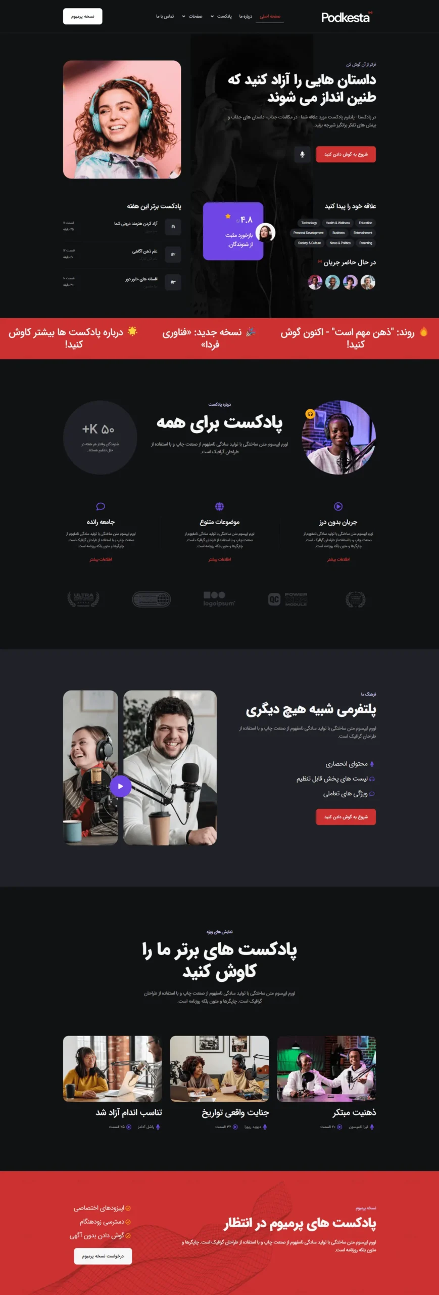 - دارای طرح صفحه اصلی حرفهای با تمرکز بر معرفی پادکست، اپیزودها و اعضای تیم